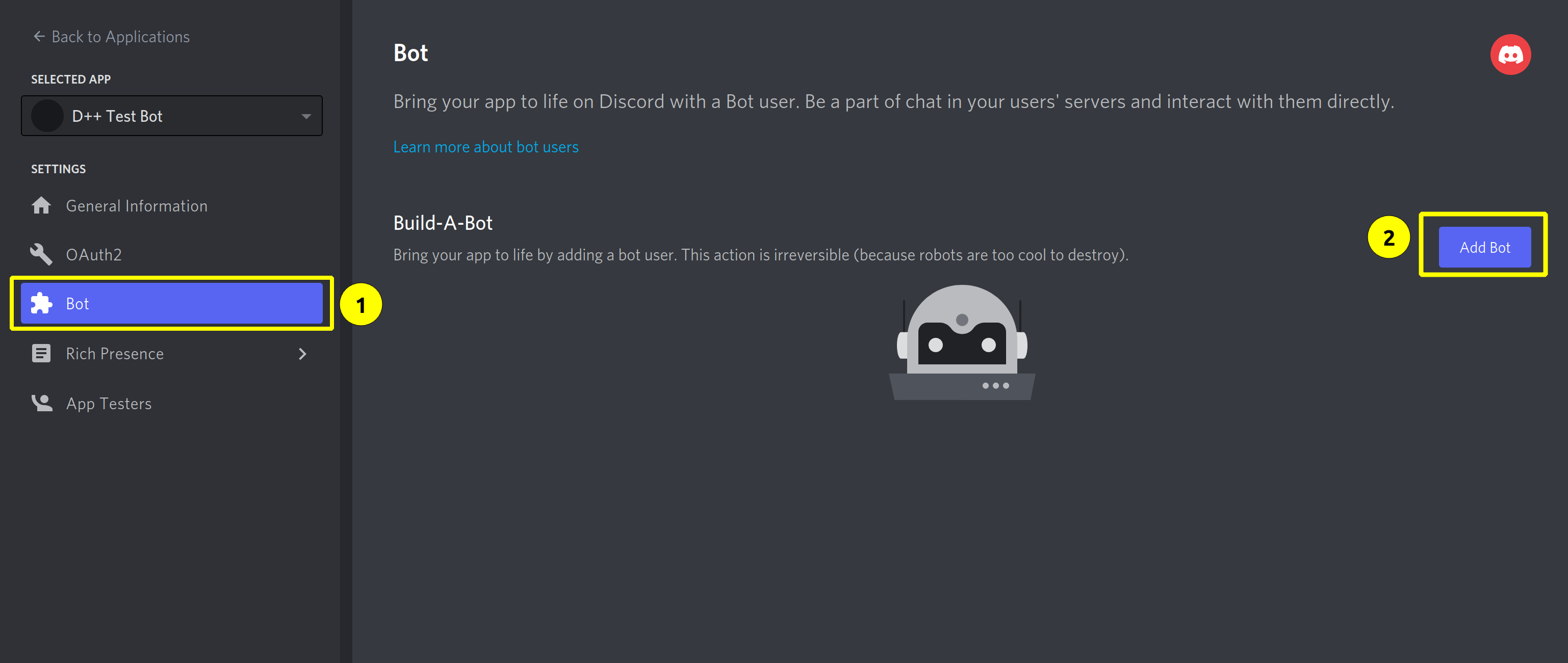 3. Move on by click the "Bot" tab in the left-hand side of the screen. Now click the "Add Bot" button on the right and confirm that you want to add the bot to your application.