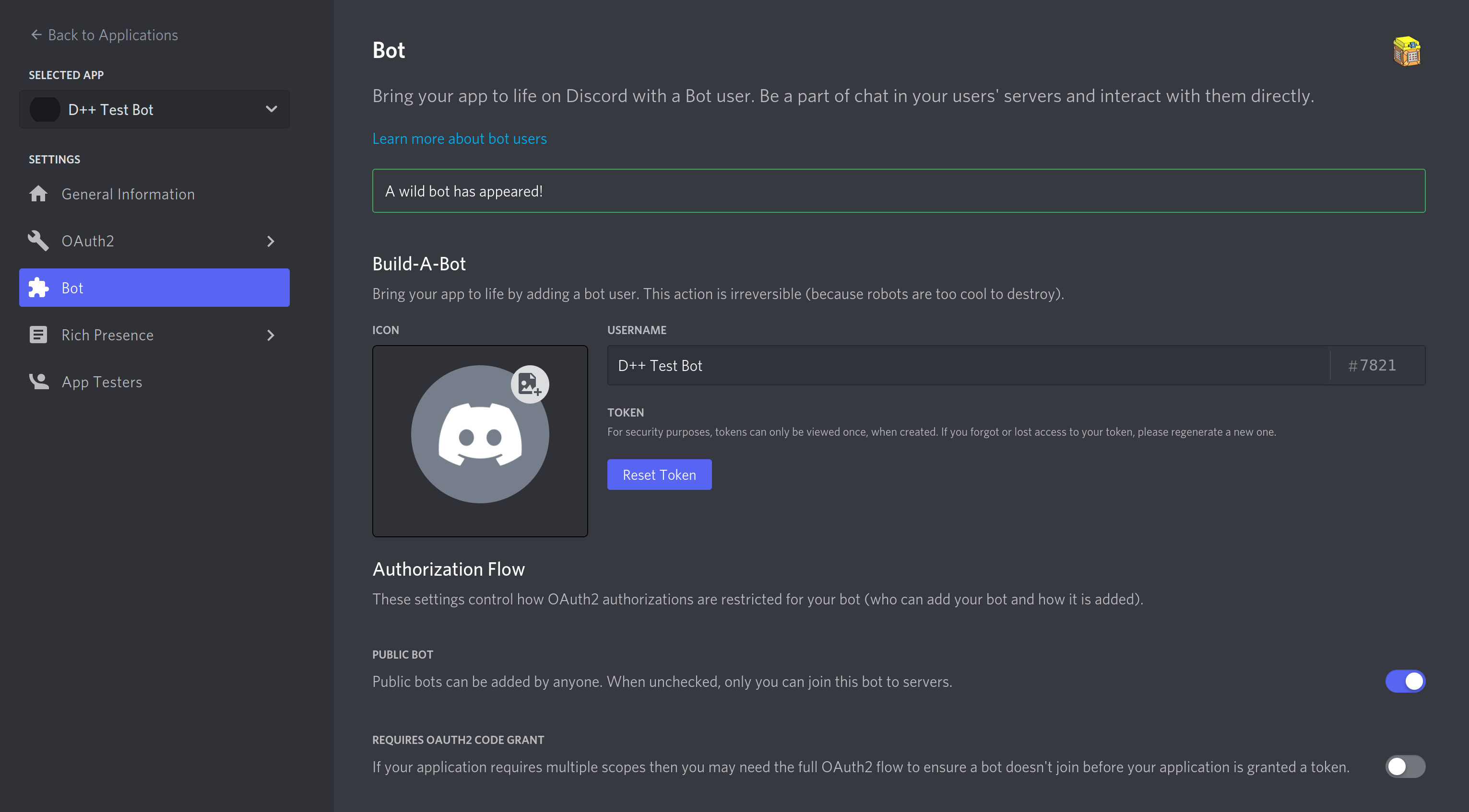 In this panel, you can get your bot token by clicking "Reset Token". A bot token looks like this: OTAyOTMxODU1NTU1MzE3ODUw.YXlm0g.9oYCt-XHXVH_z9qAytzmVRzKWTg