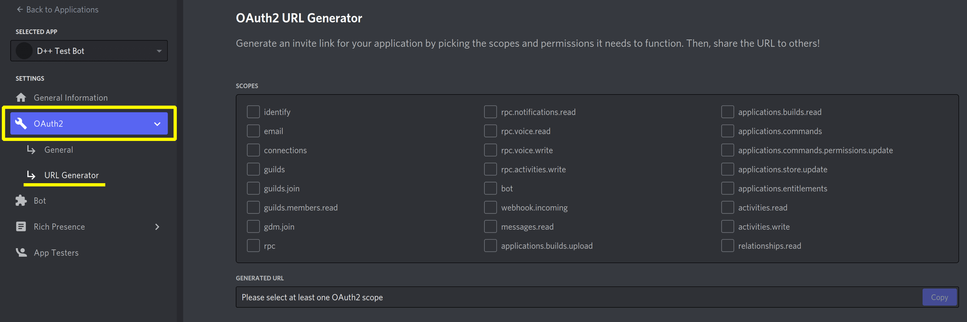 2. Go to the "OAuth2" tab and click on the subpage "URL Generator".